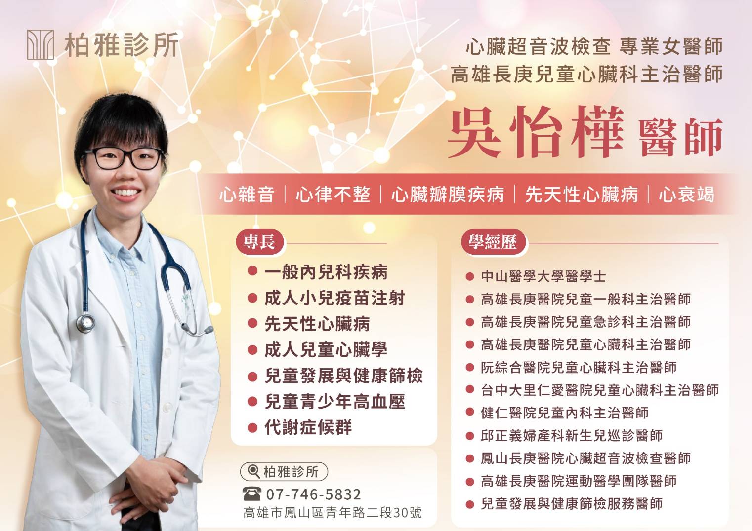 主治項目包含肝膽腸胃科、內科、兒科、慢性病控制、高血壓、高血脂、糖尿病、一般皮膚、皮膚醫學美容。